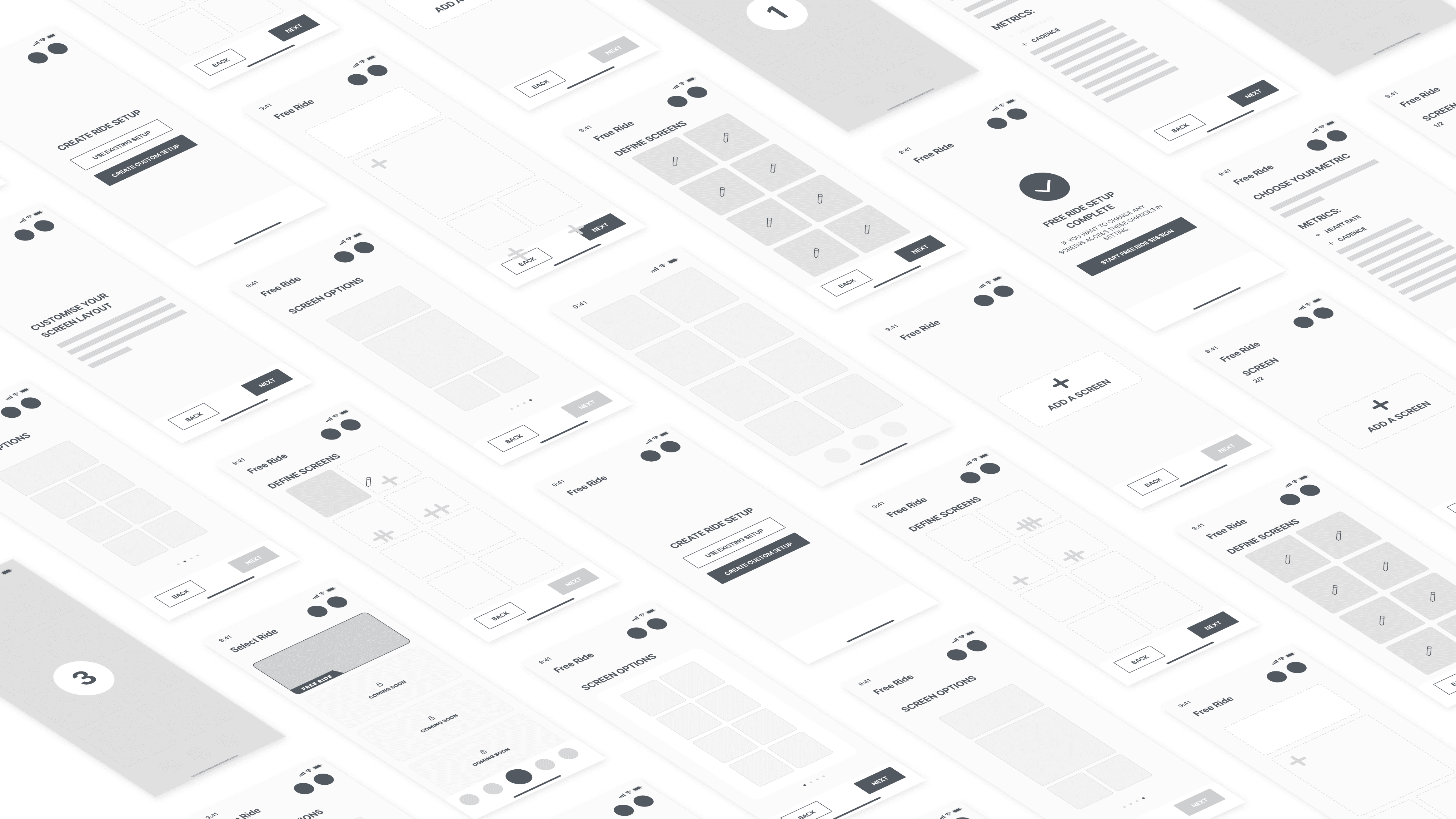 The wireframing process was used instead of jumping directly into high fidelity, even though we already had an established design system. This allowed for rapid ideation with a few potential directions for how the user would both define their screen metrics before they start their first free ride. The aim was to keep the UI minimal, readable at-a-glance, and easy to navigate around even with both handle on the handlebars.