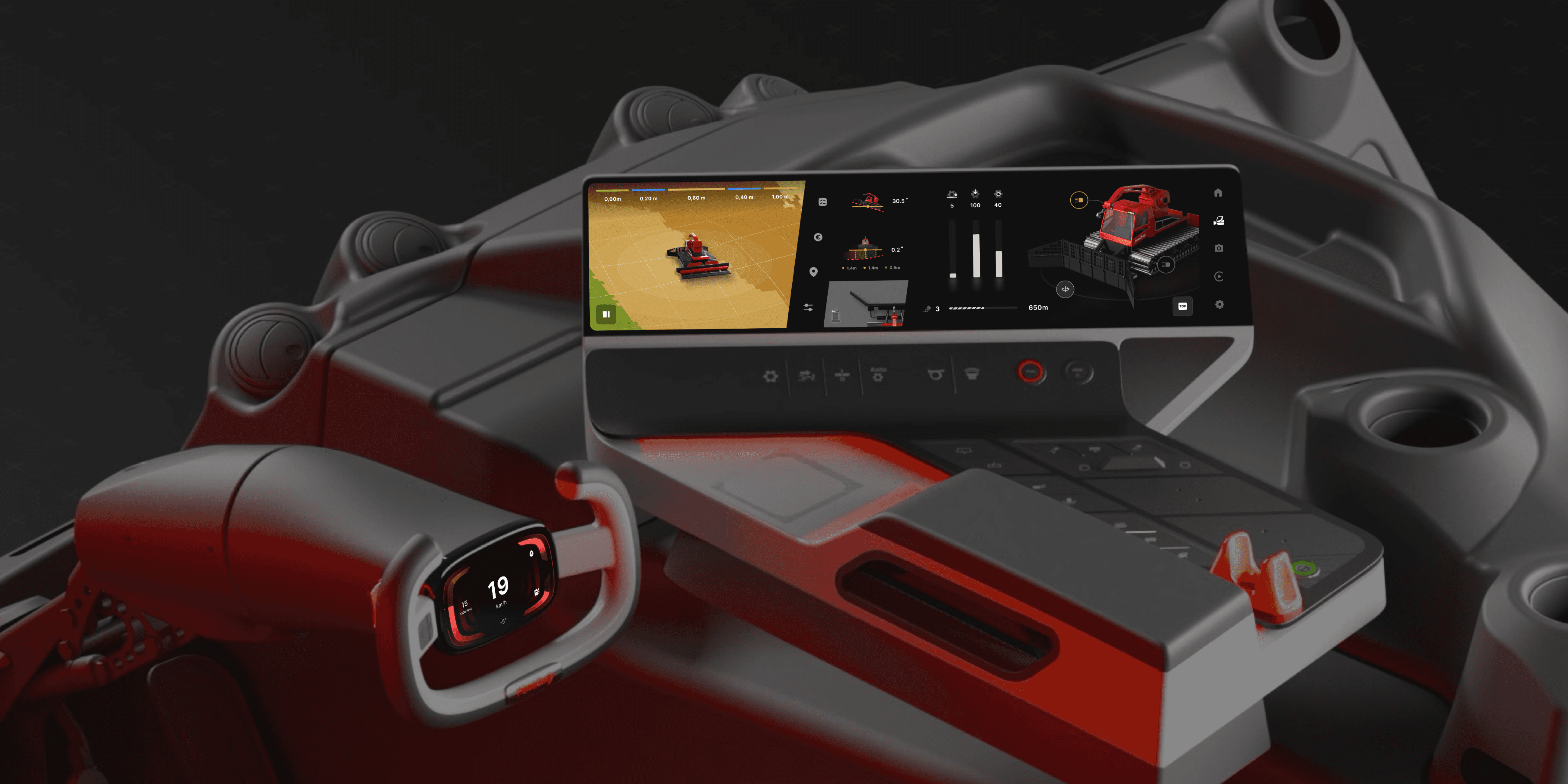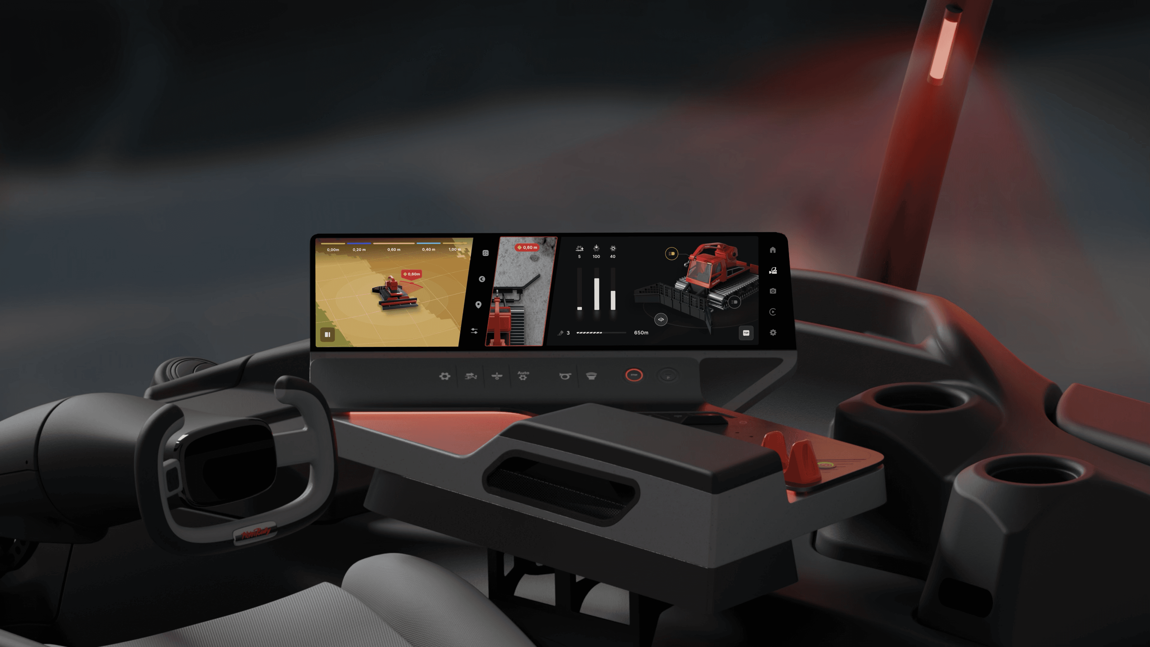 Often groomers work in conditions which do not allow for great visabilty, both from other vehicles but also linked to situational awareness for where the slopes end. We looked at how we could increase awareness by bringing in warning systems both on screen and through lighting in the cabin to make driver aware of any dangers.
