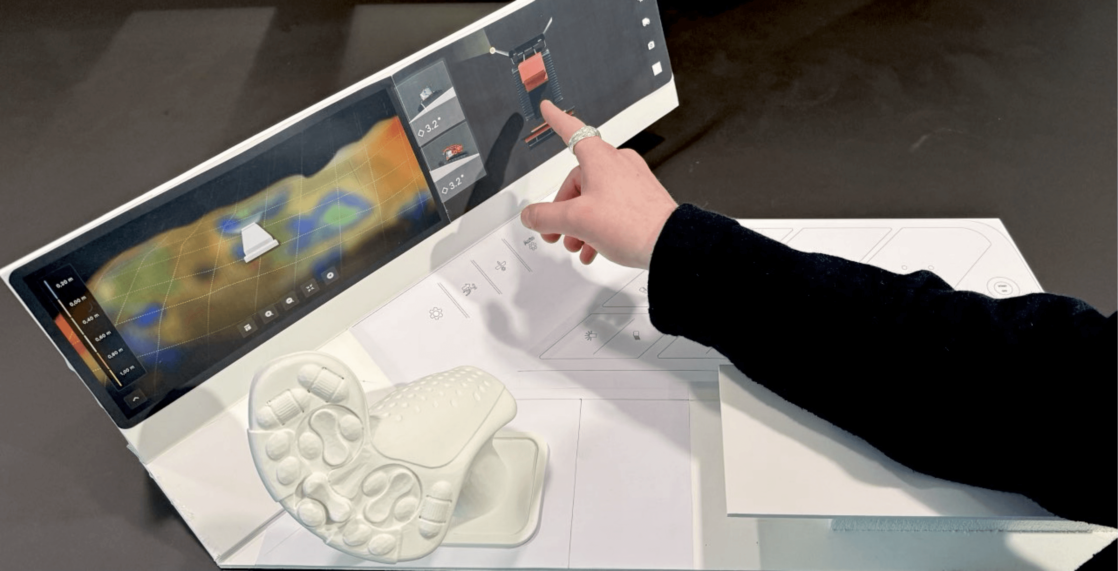 One of the biggest considerations was the joystick which drivers use, which has up to 26 different buttons and 50 additional customizable paths. While going for a 32:9 wide touchscreen we needed to ensure that the large joystick did not hinder visability and ability to interact with the screen. We created a 1:1 model to test out a variety of options